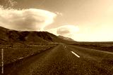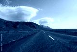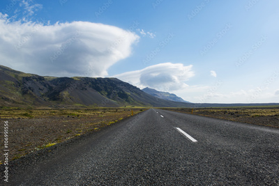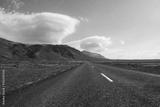 Empty asphalt road surrounded by mountains and lenticular clouds, Iceland
