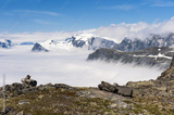 Mountain peaks above the clouds with blue sky and white clouds, view from the mountain Dalsnibba, Norway