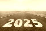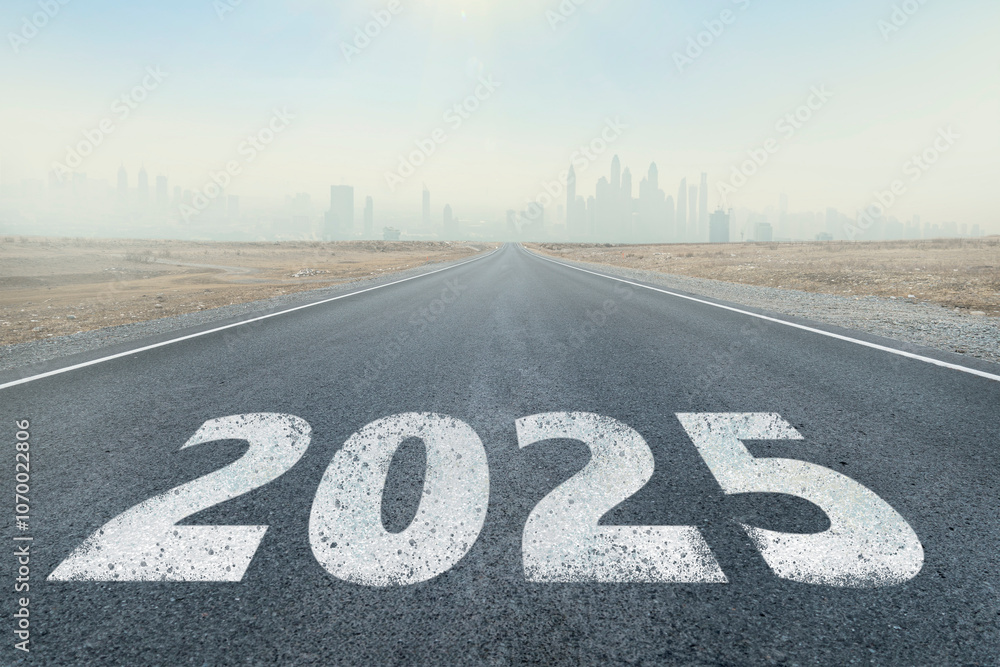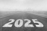 the road from 2004 to 2005. inscription 2025 written on highway road in middle of empty asphalt road and beautiful blue sky. Concept for vision new year 2025. future vision
