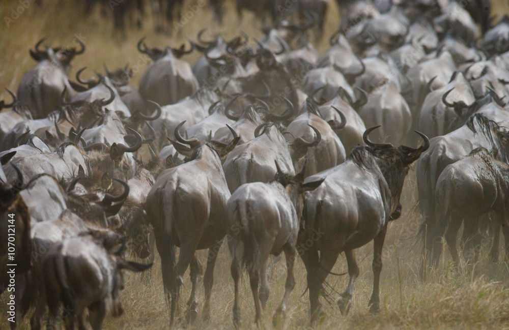 Big herd of wildebeest in the savannah. Great Migration. Kenya. Tanzania. Masai Mara National Park. An excellent illustration.