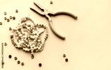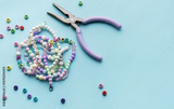 Colorful assortment of beads and jewelry-making tools on a blue surface with completed bracelets