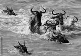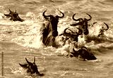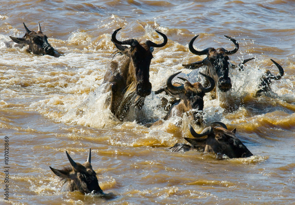Wildebeests are crossing Mara river. Great Migration. Kenya. Tanzania. Masai Mara National Park. An excellent illustration.