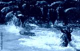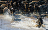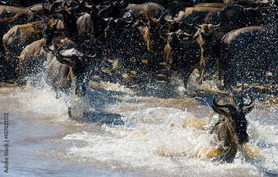 Wildebeests are crossing Mara river. Great Migration. Kenya. Tanzania. Masai Mara National Park. An excellent illustration.