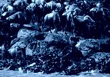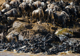 Wildebeests are crossing Mara river. Great Migration. Kenya. Tanzania. Masai Mara National Park. An excellent illustration.