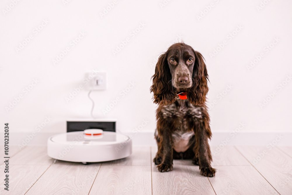 Spaniel dog sitting next to a new robot vacuum cleaner on new white wooden floor