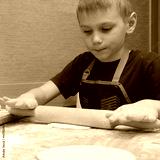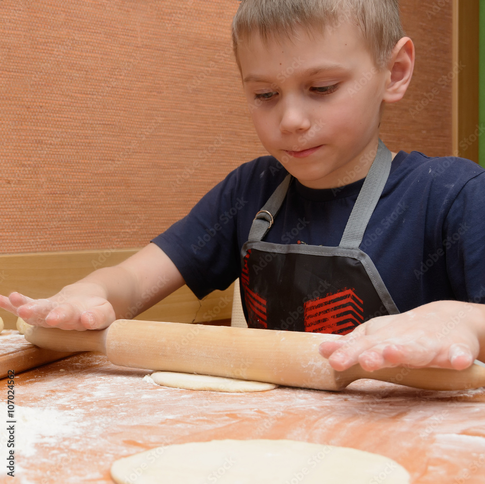 Young boy rolling dough with a large wooden rolling pin as he prepares the cakes