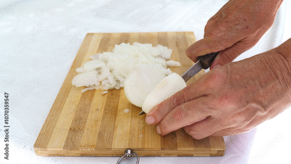 Hands slicing a fresh onion on a wooden cutting board. The image showcases culinary preparation, perfect for food-related designs.
