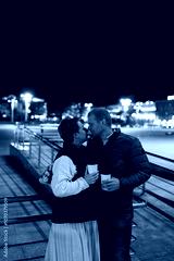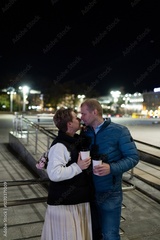A married couple walks through the city at night, holding coffee cups and enjoying each other's company