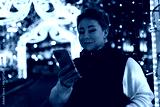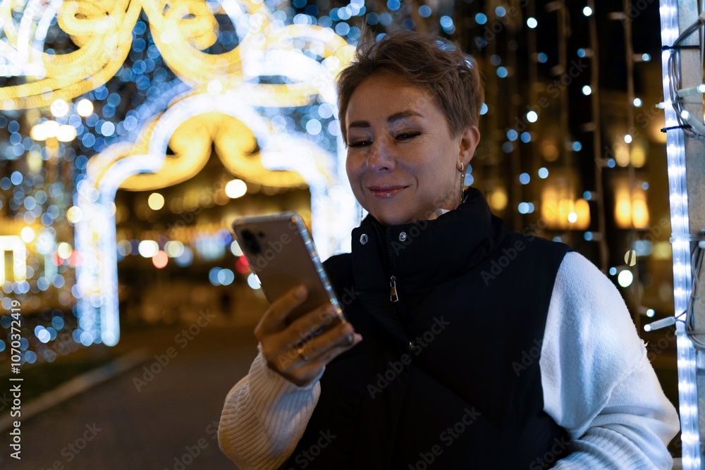 A woman walks through a city at night, looking at her phone, with bright lights illuminating the scene