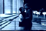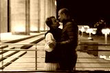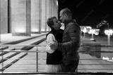A married couple walks hand-in-hand through the city at night
