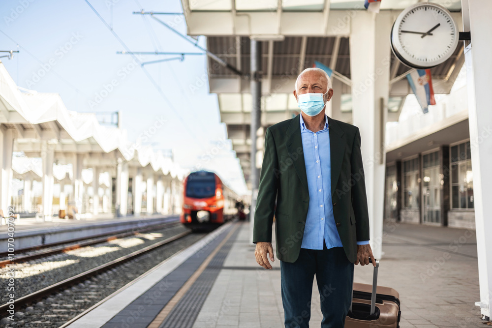 Portrait of a senior man in his 60s waiting for his train at the train station in the city. He is wearing a protective face mask, and the train is defocused in the background.