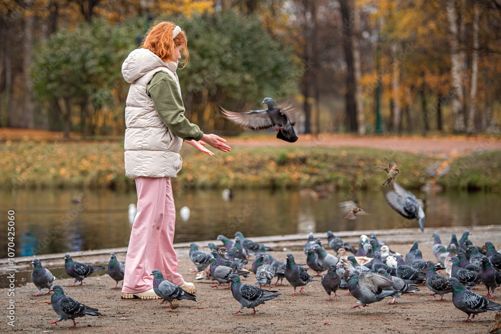 happy red-haired girl feeds pigeons from her hands during a walk in an autumn city park.