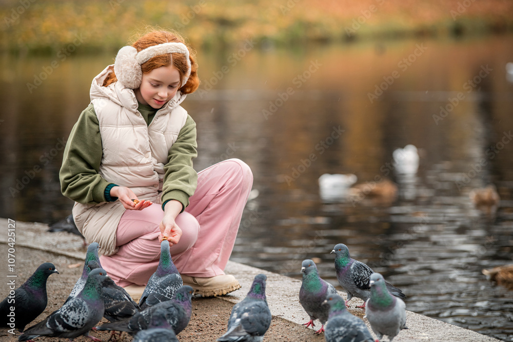 red-haired girl feeds pigeons and ducks swimming in a pond during a walk in an autumn city park.
