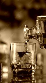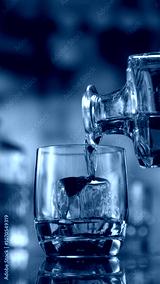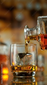 Freeze motion of pouring whisky into glass . Bar with bottles on background.