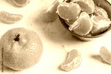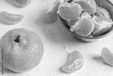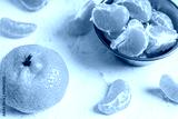 Fresh tangerine pieces in a metal bowl, top view. Sweet winter citrus. Fruit background. Copy space, selective focus.