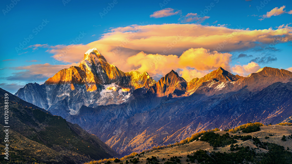 Aerial view of Siguniangshan at sunset, Sichuan in China.