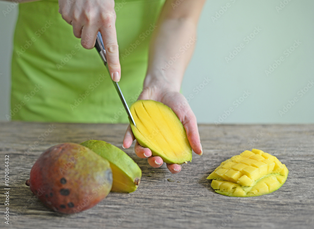 Hand Holding Fresh Mango , Cut in Square Shape Concept of Food A