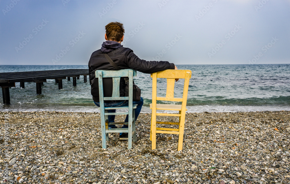 Man Sitting on the Beach with Empty Chair
