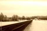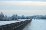 Road infrastructure. Panoramic view of the winter highway going away in the distance among the picturesque frosted trees and huts in the distance. Copy space.