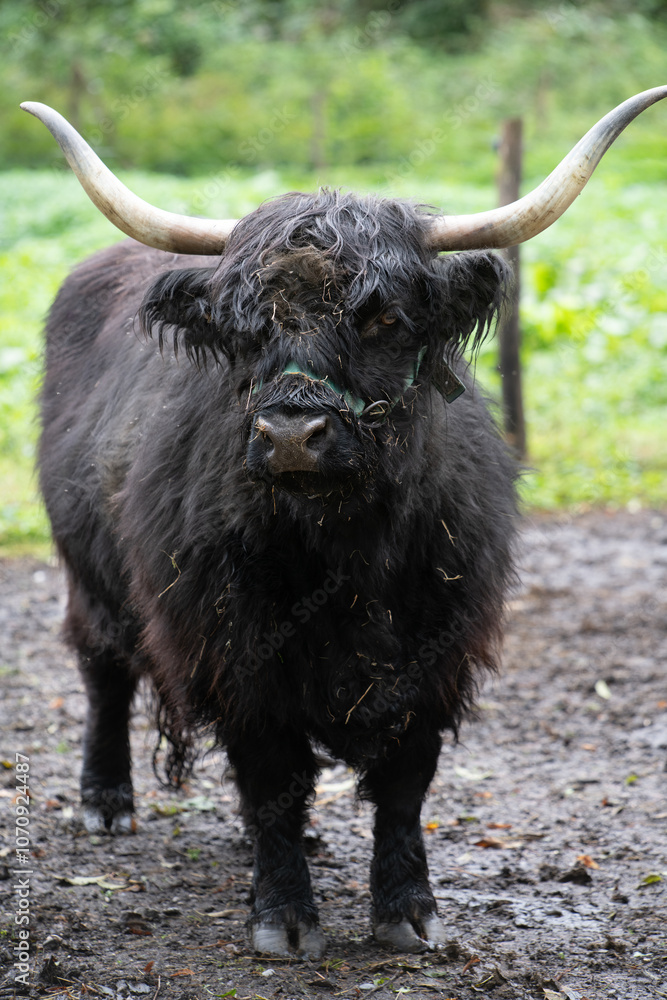 A black Scottish Highland cow with long horns stands in a field outside. A green meadow in the background. The picture is in portrait format.