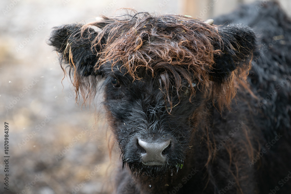 Portrait of a young Scottish Highland cow with a black coat. It is raining and the coat is still wet. The animal is looking at the camera.