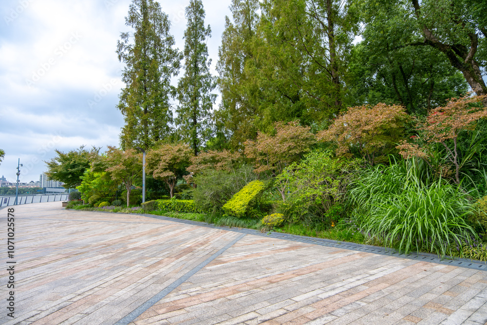 Background texture of modern hardscape plaza or paved walkway with scenic landscaping featuring mixed ornamental trees, layered garden plants in a public park. Copy space for design