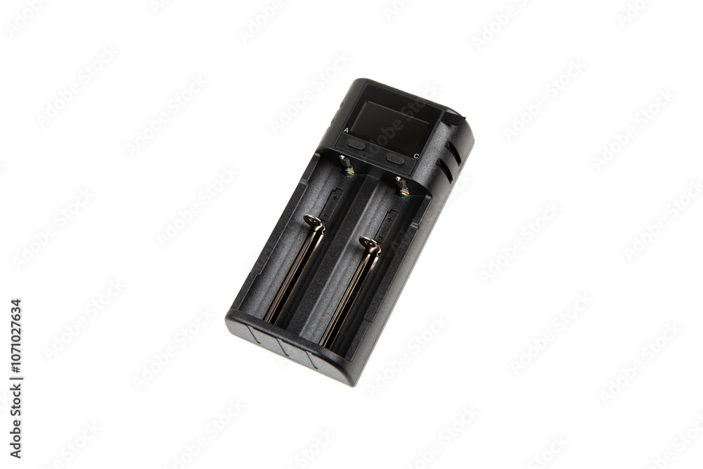 A black dual-slot battery charger with an LCD screen, designed for charging cylindrical batteries, isolated on a white back