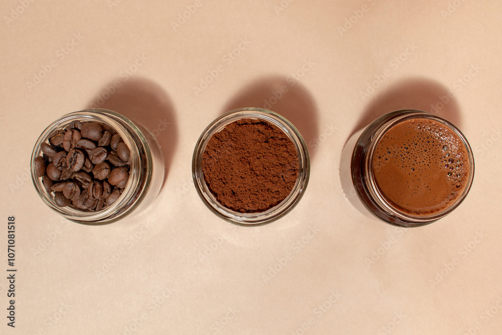 Roasted, ground and brewed coffee in jars on a beige background