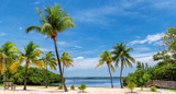 Sunny beach with coco palms and tropical sea in Key Largo beach, Florida.