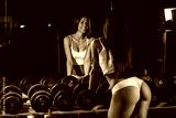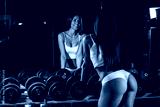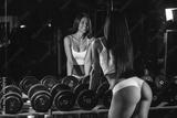 Sports girl in the gym. White shirt. Tanned. Sexy.