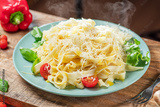 Hot, steaming freshly prepared pasta dish and fresh vegetables near it, Pasta is mediterranean Italian traditional cuisine.