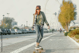 pretty girl on skate board in action - modern urban hipster girl in fashionable clothes and skateboarding on street - custom colors and selective focus on her perfect body and stylish clothes