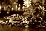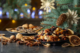 Christmas spices, various nuts, raisins, and dry citrus slices on a kitchen table.