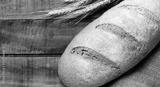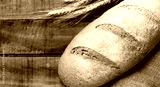 Freshly baked artisan bread with golden wheat stalks on rustic wooden table