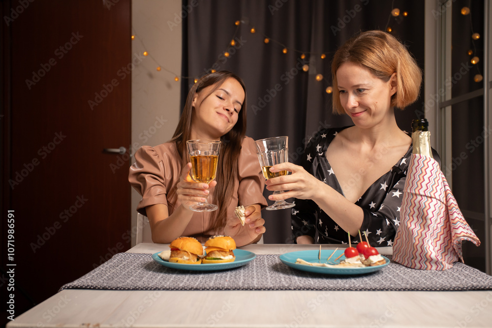 Family celebration, mother and daughter at the festive table, celebrating a birthday with family and friends