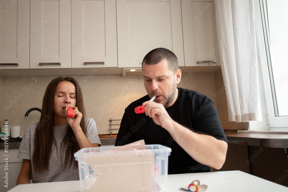 Father and daughter prepare decorations for the holiday, decorating the table, celebrating a birthday