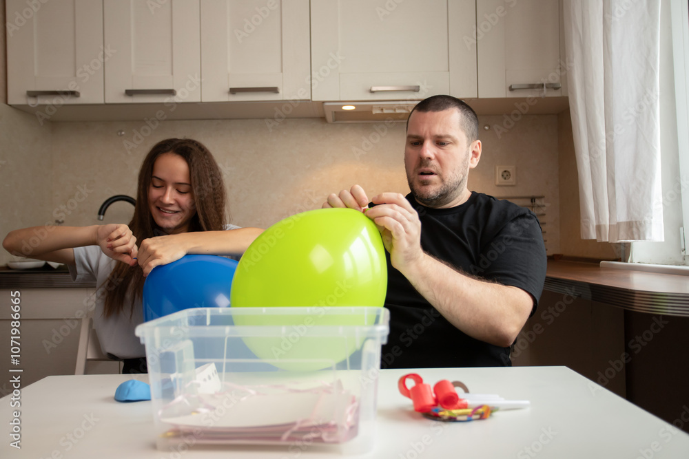 Father and daughter Blowing Up Balloons for Party Decoration, family preparing for a joyful celebration, happy moments of decorating indoors