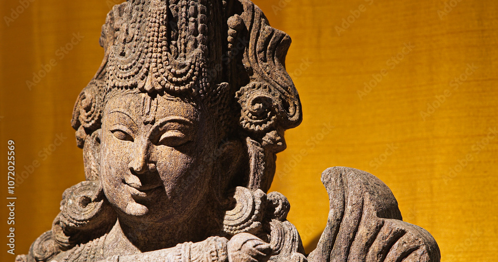 Close-up view on Statue Of Krishna Playing Flute. Krishnas Love Songs Are Both Shravya And Drishya -heard And Seen-. Krishna Is Major Deity In Hinduism. He Is God Of Protection, Compassion, Love