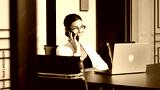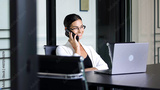 Confident businesswoman working on laptop and talking on phone in office. The concept of business negotiations, consultation and effective work in a modern business environment.