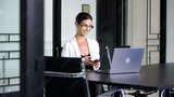 Businesswoman holding a video conference on a laptop in the office. Concept: remote meetings, effective communication, and working in a modern business environment.