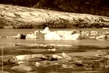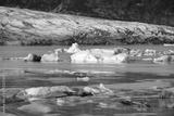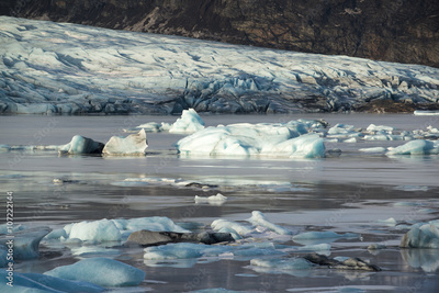 Icebergs in the glacial lake with mountains. Vatnajokull glacier, Fjallsarlon lagoon, South Iceland