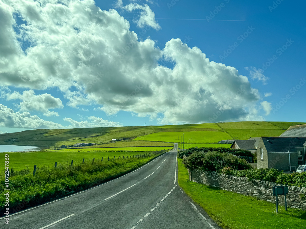 Orkney, Scotland - August 6, 2024: Sheep and farmhouses on the island of Orkney in Scotland