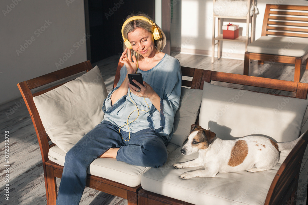Happy middle aged woman wear earphones relax on couch listen to music on smartphone