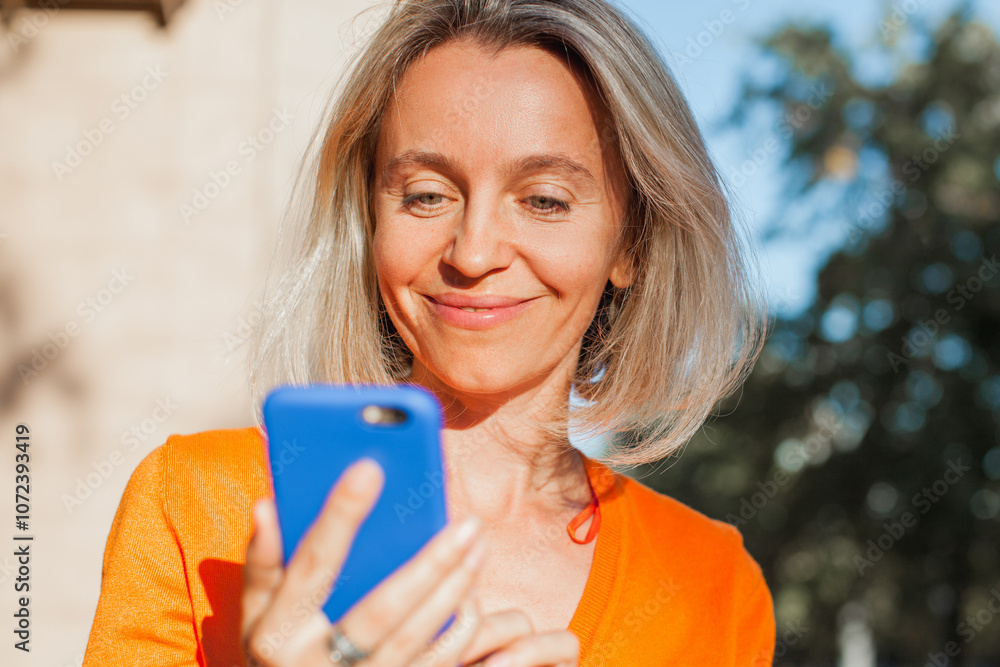 Happy middle aged woman outside in city with mobile phone