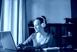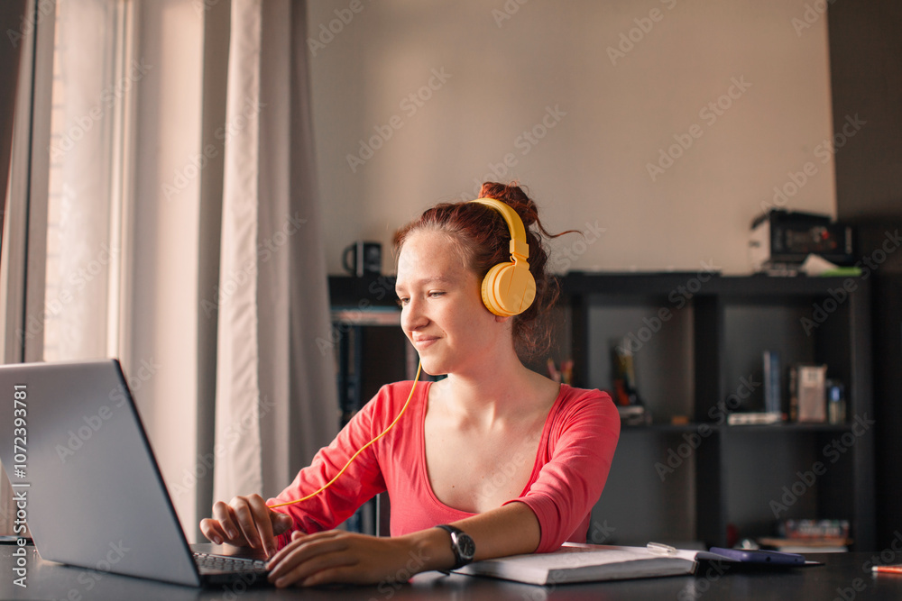 Millennial student sit at desk study on laptop