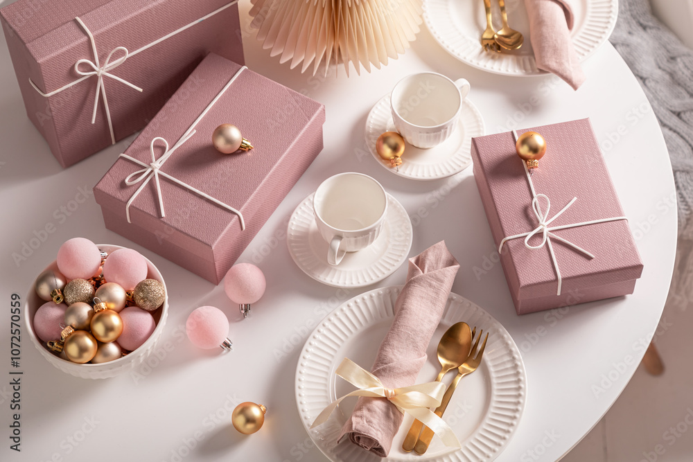 Stunning Christmas tableware for two surrounded by Christmas decorations.