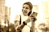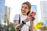 Happy young woman using mobile phone in the city