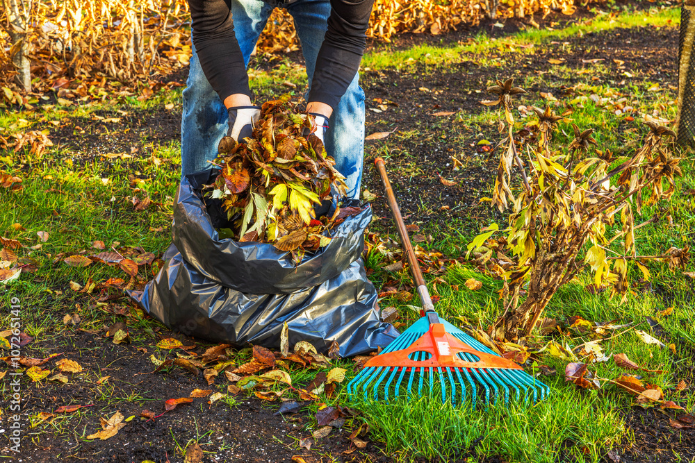 Man placing autumn leaves into black plastic bag with rake lying on ground nearby. Sweden.