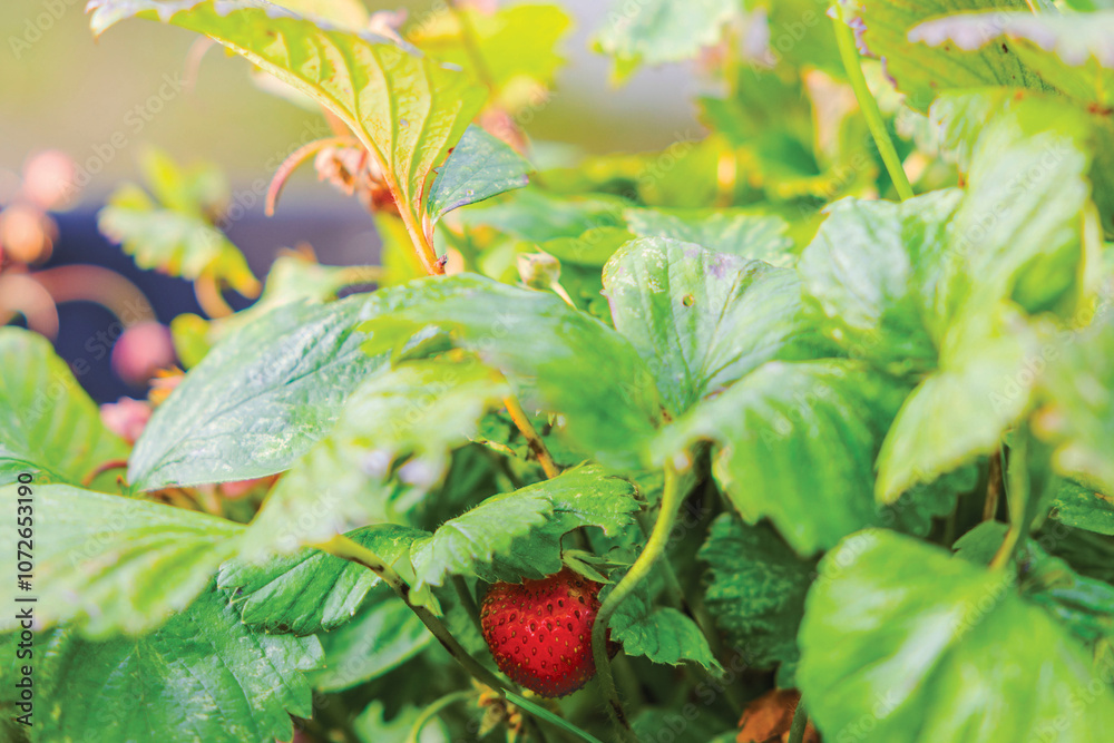 Close-up view of ripe red strawberry hidden among lush green leaves in garden.