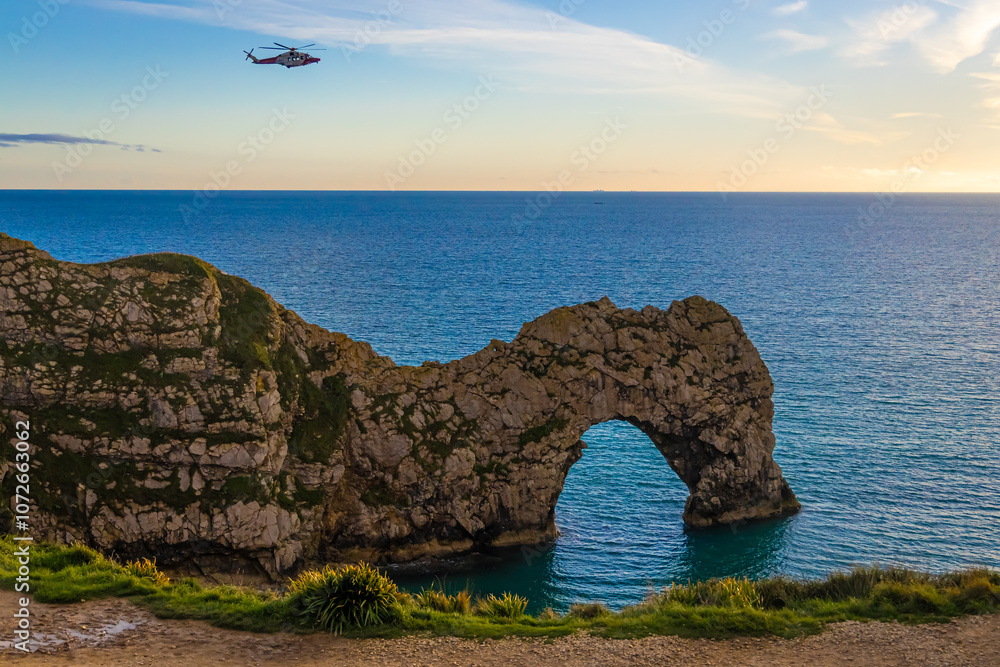 Aerial view of Durdle Door, a natural limestone arch on the Jurassic Coast near Lulworth in Dorset, England